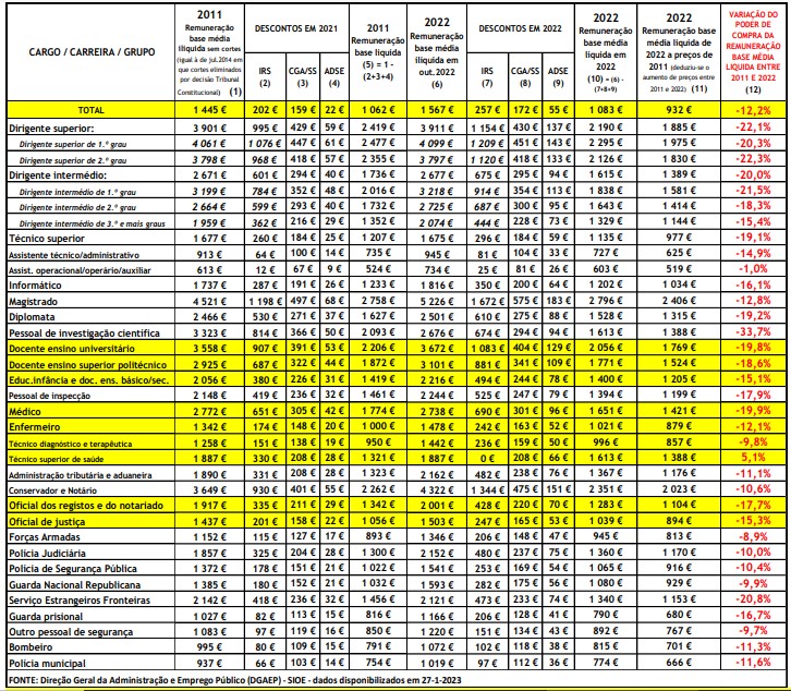 Estes dados que foram utilizados nos cálculos são os divulgados pelo próprio governo (remunerações base médias ilíquidas de 2011 e 2022 das diferentes categorias, respetivamente)