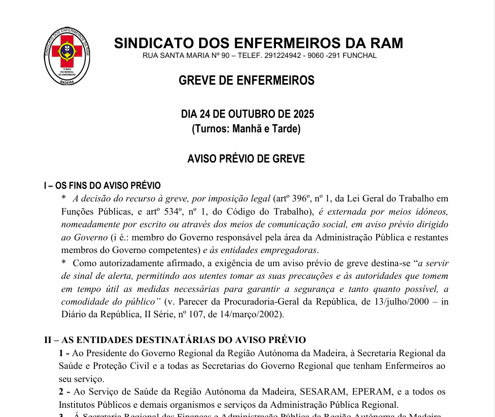 - Admissão de todos os enfermeiros em reserva de recrutamento, face à grave carência de profissionais no Serviço Regional de Saúde, que compromete o funcionamento dos serviços, as condições de trabalho e a qualidade da resposta aos cidadãos;